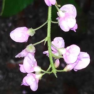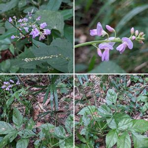 フジカンゾウ(藤甘草) *マメ科ヌスビトハギ属 花期は8〜9月 本州〜九州の平地や低山の林内に生える! 高さは50〜120cm 葉は羽状複葉で小葉は5〜7個! 花は 淡紅紫色の蝶形花を多数穂状に、下から咲き上がる。 春に楽しんだクマガイソウの葉の間からスラリと秋の花が出てきました〜❣️ 8月22日撮影