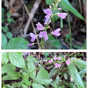 フジカンゾウ(藤甘草)。 在来種(本州〜九州) ⚠︎鹿児島県では準絶滅危惧に指定されている。 マメ科ヌスビトハギ属 里山の林にて。 ヌスビトハギとソックリだけど、比べると全体的に大きい。 見分けのポイントは、ヌスビトハギは3枚の小葉からなるが、フジカンゾウは5〜7枚からなる。豆果はソックリでどちらもひっつき虫になる。 和名は花がフジに似て、葉が薬草の甘草に似ていることから。