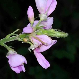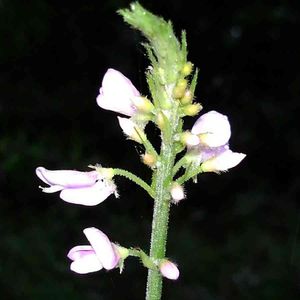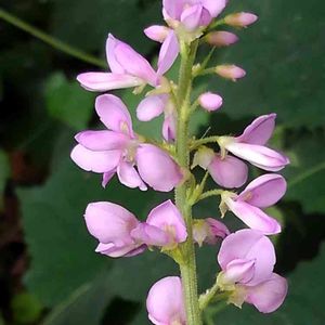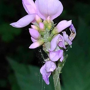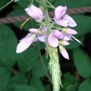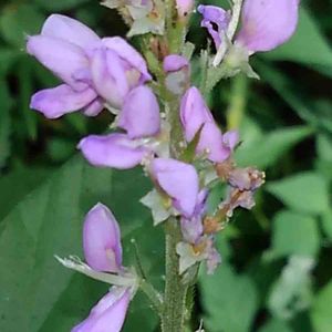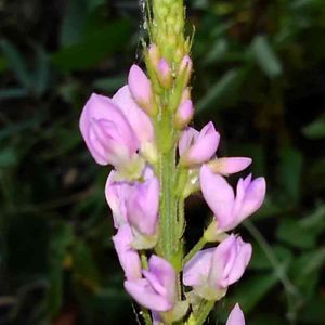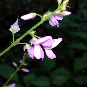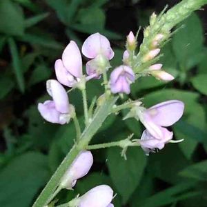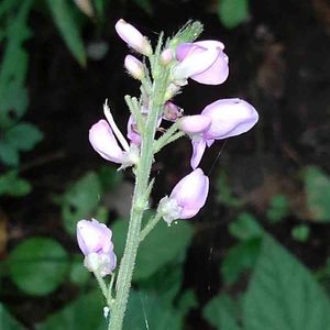 フジカンゾウです。 ヌスビトハギ属の花は小さな花が多いのですが、この花はかなり大きいです。本には花一つが8〜10mmと書いてあります。林の中で、このピンクはとても目立ちます。花の房は20cmほどになります。 このヌスビトハギ属の豆果は子供のころ、田舎では"泥棒"と呼んでいました。ヌスビトハギの盗人(ヌスビト)と同じ意味なんでしょうね😅。盗人が忍び足で近づいた時の足跡と豆果の形が似ているらしいです😊