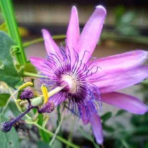 トケイソウ、アメジスト💜⏰ 🏠2階で冬越しさせていたもの。1週間程前に外に出しました 早くも開花デス 冬は雪もかなり少なく 暖かかった分🏠 もう 小さめの蕾をいくつかつけていました〜昼前に😃開花しているのを発見❣️ ただ…3本あるはずの雌しべがた1本足らず2本ですぅ〰️🤣💦〰️ 気温20℃〜蕾を付け始める例年ですが 🏠VIPぐみ、このまま蕾が増え、咲いてくれることに期待してみます💜🤭⏰ また今年も酷暑🤔❓…になる前にたくさん咲いてくれますように🤲💜💞