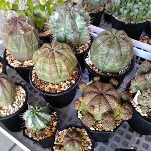 こんにちは😄 今日はずっと気温低く強風で冷たい風がビュービューな1日🌀 とうとう来たか暴風の毎日が🥲 ①オベサ達 4号鉢にお住まいの御一行様😃 重いんだよね😅 小さめな子は別のカゴ👍 ②オベサ交配実生苗 まん丸ベビーズ🎵 寒いけど外で頑張れ😜 ③蒼角殿達 前見た時よりちょっと大きくなった? 気のせいか?😂 蔓、なかなか枯れないな😅 ④⑤シゾバシスイントリカータ タニ友さんに頂いてから10年以上育て増やしまくった大事な子を、この夏に全滅させてしまった私🥲 球体をこよなく愛す私、どうしてもまた育てたくメルカリにてお迎え😂 今日届いたので強風の中で植え付け💨 ⑤植え付け後ですが、私は先に玉を太らせて大きく育てるのでヒョロい葉しか見えておりません😂 これで良いんです😁 大きくなったら表面に頭出てきますから👍 珍奇系を買って届いて、開封するのがワクワクして楽しくてたまらない😆 エケベリアだと好きだけどそこまでワクワクならない😅 やっぱり私は珍奇が好きなんだな😂