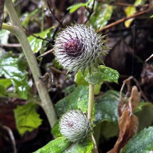 オヤマボクチ(雄山火口) キク科 アザミの花に似てますが白い綿毛が綿あめのよう 紫色の総苞片はかたく鋭いギザギザで クモの糸に巻かれたよう🕷️ ちょうど2枚目の左下に蜘蛛の巣🕸️ 開花すると黒紫色の頭花に真っ白な花粉が目立ちます。 葉っぱも大きい。 火打石で火を熾す時代に花や枯れ葉から綿毛を集め 炎がつきやすい火口(ボクチ)にしたとのこと。 別名はエンドリソウ(炎取草)