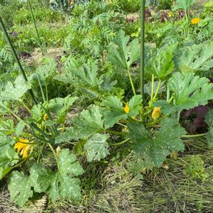 ズッキーニの雌花が咲だしたので、受粉しました🌼 ズッキーニ6株育て中。直播き3と、育苗3で、直播きしたもののほうが生育がよいです。モザイク病とウリハムシに悩まされ中🌀