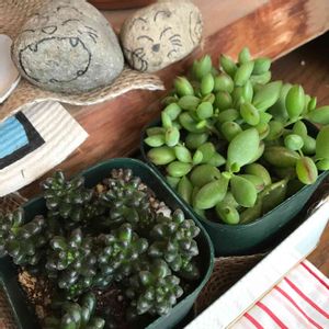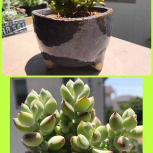 夏に帰省してる間に弱って☆になってしまったグリーンネックレス😢リベンジしようと同じ鉢にピーチネックレスを置いてもらいました。 同じく虫にやられたシュガーバインの鉢にペンデンス🌿 アンドレアナも先代は弱った子をお迎えしてしまってすぐ☆になってしまったのでリベンジ❗ ペンデンスとどちらにしようか迷っていたスノージェイドの葉っぱを、店長さんがおまけでつけてくれました😆根っこが出るよう祈ります❗