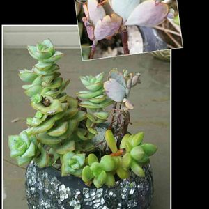 おはようございます。 ☔が降ってます。 今日の一枚は数年前に購入した多肉ちゃんの寄せ植えです。 だいぶ姿が悪くなったのでどうにかしなくちゃと思ってます。😅 上の写真は胡蝶の舞を拡大したものです。 赤ちゃんが育ってきてます。