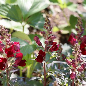 今日のお花 キンギョソウ ブロンズレッド 後ろには白いイチゴの葉っぱ 大きいんです 赤繋がりでヒューケラ ブラックフォレストケーキ 🌱で冬越ししたブルースターが咲きました 20センチくらい 春に芽が出た子も順調 この植木鉢には新たに🌱も出ています 実は種を蒔いたというよりこの鉢の上に親株の鞘が落ち、勝手に根付いたというのが正解 よほど気に入った環境だったのね