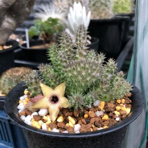 去年の春お迎えしたガガ様 名前がはっきりしなかったけど、GoogleやGSで似た株を発見したので名付け(・Д・)ノ🏷 とりあえず "黄花修羅道“ 今年もお花咲きました🌼ガガ様のお花、大好き この鉢なんか違うな😅 フェルニアゼブリナの花🍩今年は咲きそうに無いな…