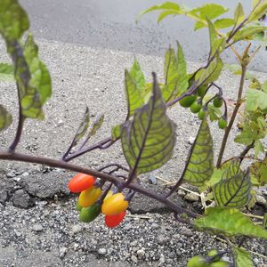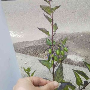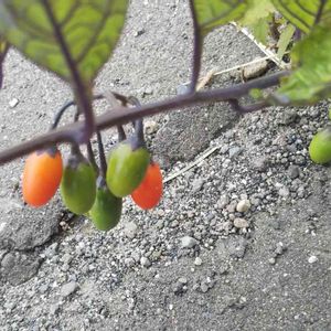 おはようございます(о´∀`о) 通学路脇ガードレールのコンクリートのスキマ。 そこから生えていた、ナス?イヌホオズキ?とみんなの物議を醸しお騒がせしていたコ。 「オオマルバノホロシ」ちゃん。実の長さが1cmを超え、ついに色づいてきました\(^-^)/