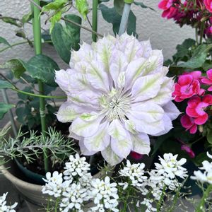三ツ星品質モニター 八重咲クレマチス はるかすみのその後 只今10輪のお花が咲いてます✨️ 小花が多いこの時期には早咲きクレマチスは お庭のフォーカルポイントになってありがたいです♡