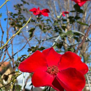 おはようございます🎵 赤い薔薇🌹ロサ・モエシー 鮮やかな花色に 黄色のおしべ 丸い小さな葉 枝はよく伸び背丈は高く 株たち状になり早期に自立します🌹🌿