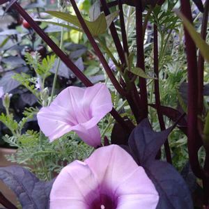 今日の花 サツマイモ イポメア ブラッキー コレがさつまいも??? 聞いてビックリでした〜ブロンズブラックのカラーリーフで、、、でもれっきとしたサツマイモだそうです〜先日行ったランチの素敵なお庭に咲いてました〜🖤💗🤎