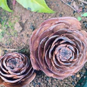 先月投稿したヒマラヤスギのボックリ、 翌日行ったらまだ沢山あったから 一つ拾ってきて、ベランダに置いておいたのね そしたらだんだん開いてきて…… 先端がポロリと離れてシダーローズになりました☺️🌹 バラの葉っぱ🌿の上に置いて🤳✨