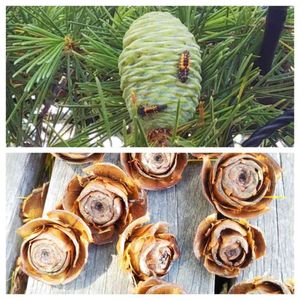 ヒマラヤスギのシダーローズ発見‼️ 喜び勇んで集めました😆 上を見上げたら、もう新しい松ぼっくり(?)ができていて、虫が集まっていました😱 美味しいのでしょうね😋