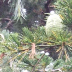 ヒマラヤスギの白い実。小さいフクロウみたい。向こうに四ツ谷駅のホームが見えます。