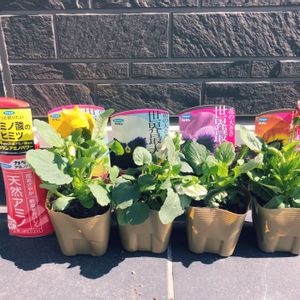 フマキラーのパンジーが当選しました✨✨😍グリーンスナップさん、フマキラーさんありがとうございます✨✨ 大輪のパンジー「ボニータ」 4株と カダンアミノパワー (スプレー式活力剤) 息子くんが苗を配置して写メ撮ってくれました✨✨😊 そのあと息子は陸上練習に行ってしまったので、娘と娘の友達と苗の植え付をしたのですが、陸上から帰ってきて勝手に植え付けしちゃったことで怒られてしまいました💦💦ゴメンよ息子💦💦 こちら成長の様子をまたみどりのまとめにアップしていこうと思います😙