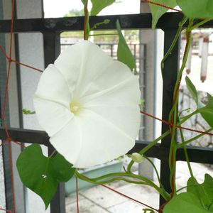 大輪アサガオが最近の雨で急成長し、やっと花が咲きました。 今年は、西洋アサガオ、曜白アサガオ、大輪アサガオの3つを育てていますが、今のところ一番背が高くなってるのは西洋アサガオ、花が多いのも西洋アサガオでした。 曜白と大輪は斑入りの葉っぱも美しいです。 小学生でも作るアサガオの鉢植えですが、花を沢山咲かせたりツルを拡げたりするには、よいところで芽を摘んだり水やりのタイミングを調整したり色々作業があるようです。
