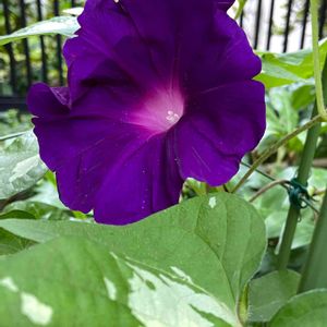 大輪朝顔 今日の趣味の園芸が朝顔だったので久しぶりにうちの大輪朝顔🎶 大きな花なのに葉の間にひっそり咲いています。暑すぎるのかなぁ🤔