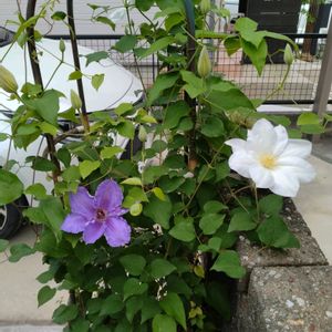 白のクレマチスは品種が定かではないんですが、多分白雪姫かなぁと… それで同じラヌギノーサ系のウィリアムケネットを、34センチの四角大鉢に一緒に植え付けました。 もう大分くたびれてるプラ鉢なので、底は切り取って、地面に根が伸びても👌なんです😁 自己満足ですが、ちょっと素敵でしょ😋