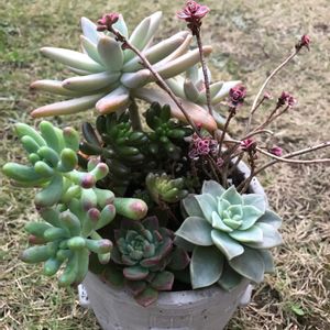 多肉寄せ❣️ 右のトリカラー寄せ植えで可哀想なことになってたから救出して多肉と寄せた💓 どこまで戻るかな😅 それにしても暴れて貧相 笑 名無しばっかで何かわからない( #●´艸`)プププ ※名前教えていただいきました💕