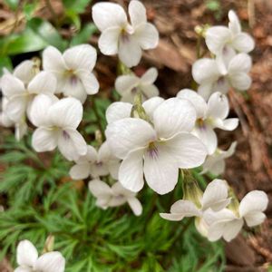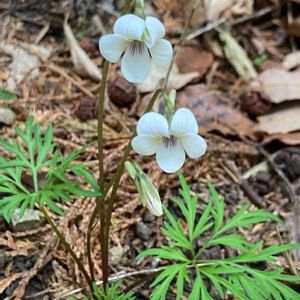ヒゴスミレです❣️コスモスみたいな葉はエイザンスミレと似ているけど、小葉の幅が細く、ほぼ5全裂します。花弁は丸く、縁が波打ちません。花色は主に白ですが、西日本には淡紅色があるそうです。4/10静岡市にて