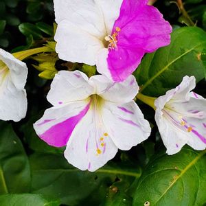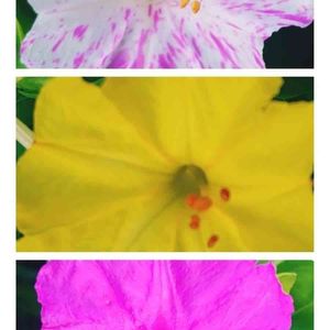 今日のお花 オシロイバナ 今、3色絞りにチャレンジ中 (黄花のオシベの花粉 クチュクチュ😆)タネ採れましたよ〜✌️ 今春、花友さんから頂いた タネからの、紅白の絞りと咲き分け💖🤍 私も 次の方にタネを繋げます💓