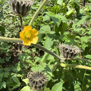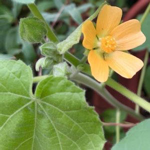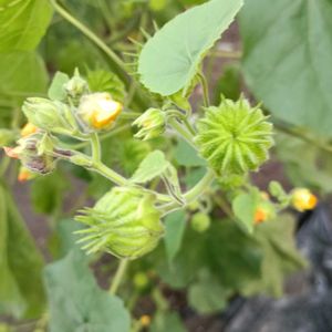 🌱💛野に咲く花💛🌱 夏から秋にかけて 径2cmほどの橙黄色の花を 上向きに咲かせます🎶 果実は半球形(径2cm) 熟すと果実は縦に裂ける この植物は全体に異臭あり😹 イチビ アオイ科