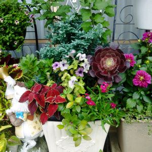 赤紫系の寄植え🪴 梅雨入りの前にペチュニアアマゾナスを切戻してカットしたのを寄植えの真ん中に挿し穂で育ててたのがやっと少しづつ花が咲いて来ました🌿