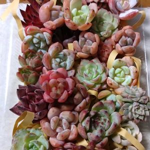 出品用の多肉詰め合わせパック作成。 今回ちょっと豪華です‼️ ハオルチア(多分レツーサ)、桜吹雪、ドルフィンネックレス、グリーンネックレス、トリカラーなど他にも詰めて送料込444円。 ハオルチアは形悪いけど根はしっかり成長してるので、これから大きくなって子株が期待出来ることもあり入れてみました☆ ハオルチア欲しいけど、ちょっと高いし他の多肉より難しそう…と思ってる方向けに。 私も最初ハオルチア綺麗だけど高いし何か難しそうと思ってて、そんな時形が悪く一部葉焼けも見られ値引きされてた子を見つけて、これなら最悪失敗しても…と思い購入した事があります。そして、その子は今でも元気に成長してます(=´∇`=) ただハオルチアは、殆ど持ってないのでこれから増やして行きたいなと思う種類です。 十二の巻を持ってるのですが、目を見張るぐらい日に日にデカくなっていて…ちょっと驚いた。 嬉しくもあるけど小さいうちの方が好き…早く子株付けてくれると良いな。ただハオルチアはどう株分けするんだろう…と毎回悩む😅 オブツーサ系は持ってないけど、子株でわんさかになってるのなんか大変そう(笑) あと美味しそうに見えるwww