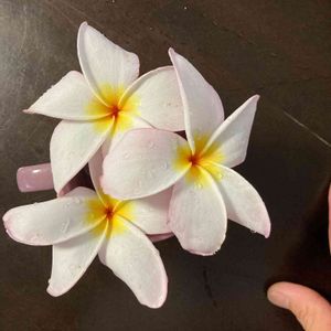 雨で落ちたプルメリア この品種は花持ちが悪いので生けても1日位で萎れます。 サイズは現在8〜9cm位です。