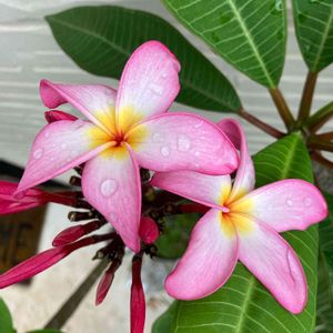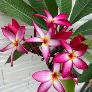 やっと本調子になったプルメリア 。 品種はカラカウアスター。 数日前に咲いた花は薄いピンクで広い花弁ですが、暑くなると細い花弁に濃いピンクの縁どりの花弁になります。 プルメリアは肥料・気温・日照で同じ株でも僅か数日でこれだけ変わるんですよ〜(`・∀・´)