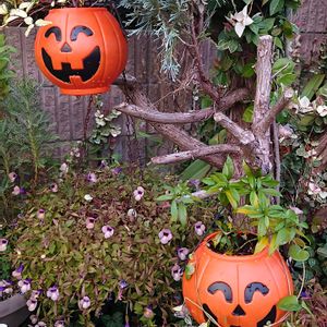 ハッピーハロウィン🎃🎃🎃 ダイソーのハロウィンちょうちんに 熱したドライバーで穴開けて ハンギング鉢作りました シルバークレストの枝に掛けてみました チョット それっぽいお花🌛🩵🌟✨👻💀🎃🎃🎃🎃🎃 葉っぱは 株分けしたものと なんか いつの間にか生えて来た 雑草のツル⁉️🤣🤣🤣