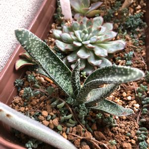 先日苺苗を貰った時 ガステリア墨鉾の鉢がギュウギュウになったからとバラされていて、仔が沢山ありました。 去年貰ったのが無事育っているのですが、沢山あるからと 又貰ってきました。