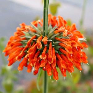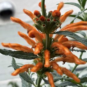 【カエンキセワタ(火炎着せ綿、レオノティス、ライオンズイヤー、クリスマスキャンドルスティック)】 南アフリカ原産、シソ科常緑小低木 茎の上部に輪散花序を出し、長さ7~8cmで橙色~橙赤色の唇形花を茎を取り囲むように輪状に咲かせる。 「火炎」の意味は、花の色と形が炎のように見えることから。なお、学名や別名は「ライオンの耳」という意味。 草丈:0.6~2m 開花時期:10 月~ 12 月 花色:橙色、白色 近所の駐車場