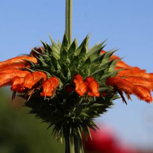 クリスマスキャンドルスティック (シソ科) 別名 ライオンズイヤー、レオノティスなど 原産地 アフリカですが、世界各地で帰化状態。 茎頂に球状の花序を出し、長さ2㎝程度でオレンジ色の筒状花を放射状に付けます。 段菊みたいな咲き方。 山下公園にて撮影📷