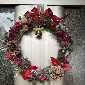 こんにちは♪ 前に作ったリースをとりあえず玄関🚪に飾っていたら 今朝、なんかおかしい🤔? 良く見ると赤いサンキライの実が 全部サッパリなくなって⁇いる‼︎‼︎ 🐦に食べられたのでしょうか🤣😂 昨日に作った娘宅へのリース 派手目にと赤いリボンを100圴で買って来ました❤️✳︎ 100均に行くと ついあれもこれもと長居をしてしまって😅 娘宅のは我が家のゴールドクレストも入れてみました🌲 リースに使用される事は余り無いようですが黄緑色がフレッシュ感を出してくれるので個人的に好きです😉🎶 後、友達へのはまた週末に〜 週末は一層寒くなるようですね… 皆さんも温かくしてお過ごしくださいね🧣🧦