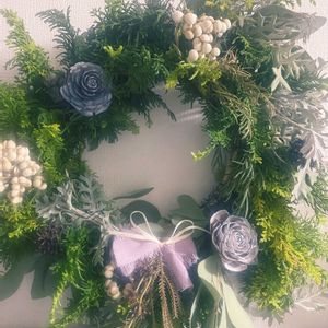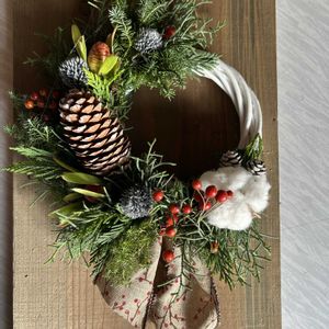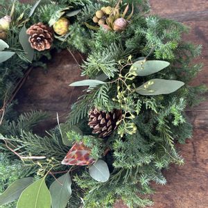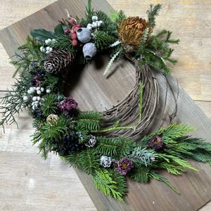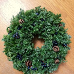 ヒムロ杉とコニファーブルーバードでリースを作りました。飾りはティナスベリーとメタセコイヤの実のみで、たっぷりの緑が際立つように仕上げました。
