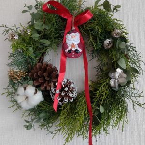 クリスマスですね~🎅 メルカリでグリーンを譲って頂きリースを作ってみました。難しかったですが何とか…😂不格好ですが香りが良いです。 来年またトライしたいです。