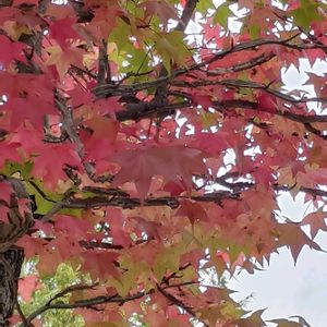 🏷️真っ赤な火曜日 参加します❤ まだまだ緑が多いと思っていましたが 急な寒さで少しずつ紅葉が😍 モミジバフウでしょうか 秋空に映えます🥰 ④ こちらも先程の投稿と同じで🤭 こぼれ種からのニチニチソウ😍 真っ赤です❤