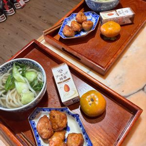 夕ご飯 冷凍太うどん、青梗菜、白だし チキン唐揚げ 柿 アーモンド効果 鍋でうどんと青梗菜を煮込んで盛り付け。 庭の柿と買い置きのアーモンド効果に助けられてる。 まだ疲れが取れないけど食欲はあるから何とかやれそう。
