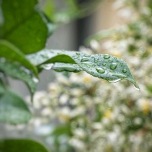 「ツバキの葉」 最近、急な☔雨が多くなって来ました。 現在も、どんより雲って今にも降りそう。 こちらは、昨日のツバキの葉と背景は ナンテンの花。 🏷水滴の水曜日