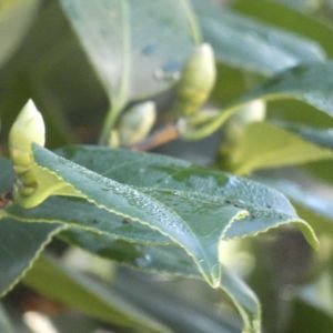 「ツバキの葉」 昨日からの雪も、朝になると雨になって葉にも沢山雨粒が付いていました。 🏷水滴の水曜日