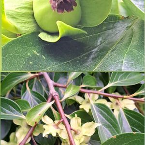 秋色の代名詞、柿色🧡🤎✨🎶 小さい秋見つけた〜🍁✨🎶 10月上旬の花散歩では、 柿の実も葉っぱも色付き始めでした💛🧡🎶 今は葉っぱも落ちて、実だけになっていました。 最後のpicは、今年5月のお花(雄花)と落花。 カキノキ カキノキ科 カキノキ属 「今日のお花」 カキ