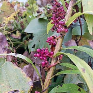 丸いお皿に盛られた可愛らしい実も見つけました👀💕🎶 水辺の散策路、いつもは両脇が草むら過ぎて、足を踏み入れられないのですが、この時は綺麗に手入れをされた直後🥰💕🎶 イシミカワ、ずっと探していた青い実でした🥹✨🔵🎶 イシミカワ タデ化 イヌタデ属 茎の長さは1-2mに達し、蔓状。 葉は互生し葉柄は長く葉の裏側につく。 葉の形は三角形で淡い緑色で、表面に白い粉を吹いたようになっている。 さらに丸い托葉が完全に茎を囲んでおり、まるでお皿の真ん中を茎が突き抜けたようになっているのが目印でしょうか🤔🎶 茎と葉柄には多数の下向きの鋭いとげ(逆刺)が生える。 7-10月に薄緑色の花が短穂状に咲く。 花後につく5mmほどの果実は熟して鮮やかな藍色となり、丸い皿状の苞葉に盛られたような外観となる。 この藍色に見えるのは実際には厚みを増し、多肉化した萼で、それに包まれて、中にはつやのある黒色の固い痩果がある。 つまり、真の果実は痩果なのだが、付属する器官も含めた散布体全体としては、鳥などについばまれて種子散布が起こるブドウなどの様な漿果(しょうか)のような形態をとっている。 🏷️草むら探検隊