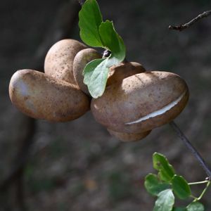 ジャガイモ🥔ではありません💦 ミツバアケビの実です。 アケビ科 アケビ属 落葉性つる性木本 山野に生え、果実は食用になる。アケビとともに秋の味覚として親しまれてきたつる性の植物で、 3枚の小葉があることからミツバアケビとよばれる。 アケビよりいくらか山奥に生える。 アケビに比べて育成地域が広く、荒れ地や乾燥地でも旺盛に繁殖する。 果実は液果で、厚い果皮に包まれ、長さ10 cmほどのずんぐりした繭形か、長楕円形になる。 果実はアケビに比べて先端側のほうの膨らみが大きく、全体に太い。 秋に熟すると、緑色から紫色または赤紫色に変化し、果皮が裂開して中にゼリー状の果肉がある。 果実がアケビよりも大きくなることから果樹としても栽培される。 最後のpicは、①の子が10日後のパッカ〜ンと割れた姿です💔🎶💦