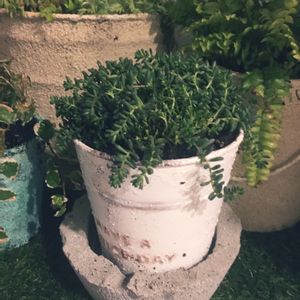 自作リメ缶にセダム。 そこに自作モルタル鉢受け。 いいインテリアになってくれてます。