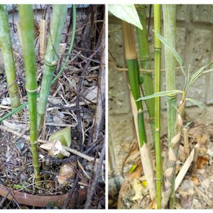 GS始めたばかりの頃に投稿(2020/1/28)した笹か竹のつづきです。 母の代からあるお正月の寄せ植え盆栽を頂いたときにあったもの💛 品種を知りたくて色々調べましたが、特定はできなくて、 新芽の写真を撮らなくてはと思っていましたら、何日か前に新芽を発見💛 左が2020/3/23 右が2020/6/1 スマホの写真アプリで品種を調べましたら、蓬莱竹とヒット😊 また、ウキネットの蓬莱竹の概要に、 「葉脈は平行脈のみで、横脈を欠く。タケノコは初夏から秋にかけて出る。」 とあり、うちのは格子状でなく、平行なので、蓬莱竹でしょう💛💛💛