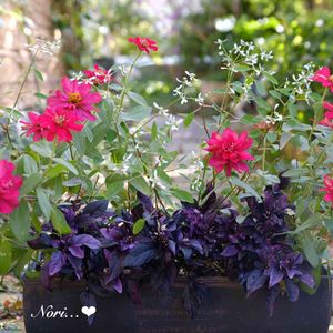 ジニア❀❀ ユーフォルビア ダイヤモンドフロスト❀❀ トウガラシ パープルフラッシュ❀❀ この寄せ植えを作ったのは夏🌞 長い間玄関を華やかにしてくれています。 今年ハマったのがジニアとトウガラシ🌶 紫のグラデーションが美しい葉💜小さな実はシック💜🖤 ビビットピンクのジニアとシックな葉のトウガラシ、それを繋いでくれるユーフォルビア(ちょっとお花が少ないですが)。 どのお花も花期が長くてお手入れ入らずでした。