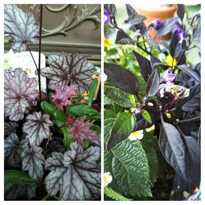 観賞用トウガラシ パープルフラッシュ💜 葉っぱの色が変わってるなぁ〰️斑入りで気に入りました😘 で…お持ち帰りで寄せ植えに使いました。 寄せ植えの全体像はイマイチだなぁ〰️🤭