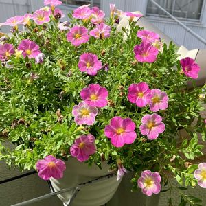 タキイのカリブラコア ファンシーピンク🩷 大きくなってます✨ 昼間、暑すぎるので、日が当たる時間が短くなるように、このあと下に置きました。そろそろ切り戻しかな。 水やりは、何とか1日1回でいけています。