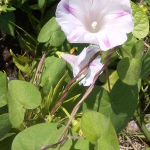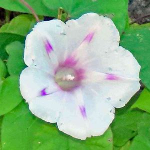 【マルバアサガオ「ミルキーウェイ」】 メキシコから中央アメリカ原産、ヒルガオ科一年草 江戸時代初期に観賞用として渡来し、暖地を中心に各地に帰化した西洋アサガオ。 白地に青紫~赤紫の放射線の花を付ける。 変化朝顔の一種で、早朝の開き始めは青紫色をしていて、次第に赤紫色に変わる。 日本種の朝顔よりやや花持ちが良く、真夏でも10時位まで咲いている。 秋になると夕方近くまで咲いていることもある。 草丈:2~3m(つる長) 開花時期:7月〜10月 花径:5~8センチくらい 花色:白地に青紫~赤紫 セミナーパーク@山口市